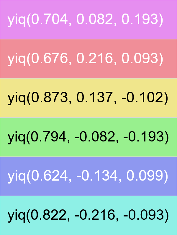 This example creates a palette of six colors evenly distributed across the entire HSL color wheel. To do it, we set the rotation step between the shades to 60°, so that all six colors cover the full spectrum (360°). We start with khaki as the initial color but increase its lightness to 75%, converting the colors into soft pastel tones. The resulting palette is exported in a rather uncommon color format called YIQ.