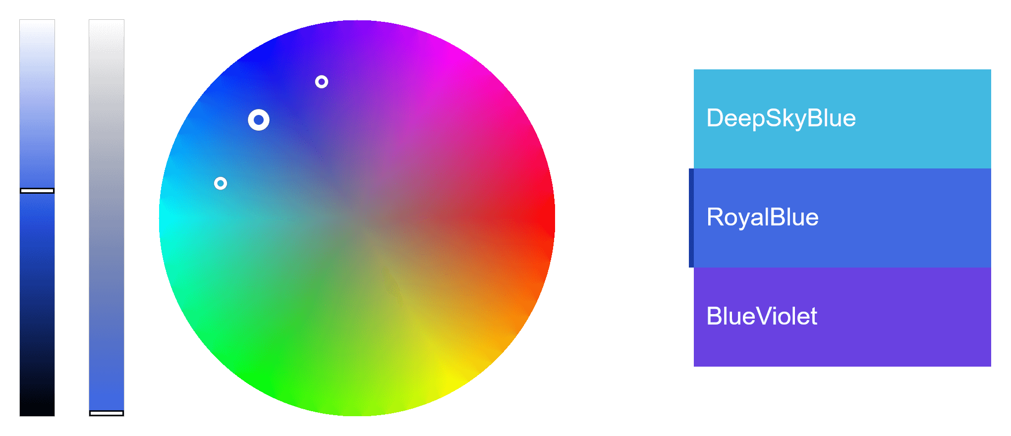 In this example, we create a palette of three analogous colors in the blue hue range. We specify "RoyalBlue" as the starting color and set the hue step to 30°. As a result, the output palette includes "DeepSkyBlue" (rotated 30 degrees counterclockwise on the color wheel) and "BlueViolet" (rotated 30 degrees clockwise on the color wheel) along with the starting color.