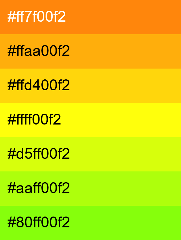 In this example, we generate a set of transparent analogous colors with a very small hue shift of just 10°. As a result, every two adjacent colors look almost identical, creating a smooth gradient effect across the entire palette. Additionally, we reduce the opacity to 95%, making the colors 5% transparent. The color swatches in the palette also include 8-digit HEX color codes, where the final two characters encode the alpha (transparency) value.