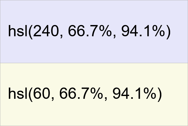 This example creates a soft hue combination by starting with a lavender hue and generating its opposite hue in the HSL color space. The result is a pastel ivory hue, positioned directly across from lavender starting color on the color wheel. Both colors are very light as the lightness is set to "94%" in the settings. In the output palette, we outline each color with a thin line and save only the colors (without the wheel).