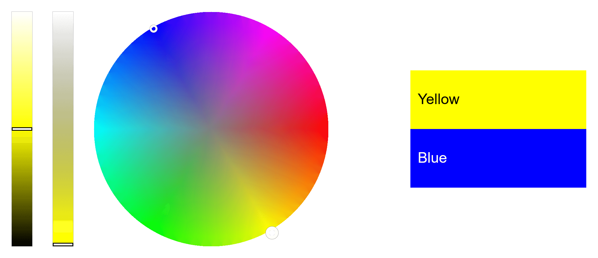 In this example, we select "Yellow" as our base color and the tool instantly identifies "Blue" as its direct complementary partner on the color wheel. Both colors use 50% lightness and 100% opacity, creating a strong contrast because they are exact opposites on the color wheel. We draw both colors on the output palette and display their text names next to them. For the download, we choose the full canvas format, including the color wheel and lightness/opacity sliders.