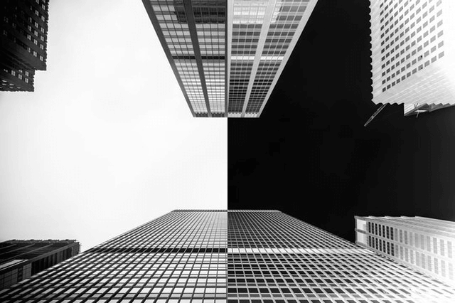 In the input of this example, we load a grayscale PNG photo of a building and invert the pixels in its right half. As a result of inversion, the white and back colors swap – white turns to black and black turns to white. In the output, we see that in the left half of the PNG we have the original colors (black buildings and a white sky) but in the updated right half, we have a black sky and white buildings. (Source: Pexels.)
