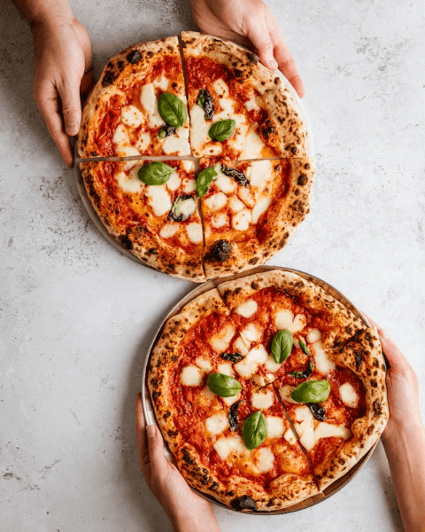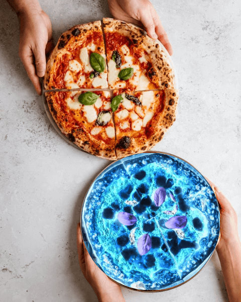 In this example, we're working with a PNG image with two identical pizzas and apply the color inversion effect to one of them. To accurately cover the circular shape of the pizza, we select the mode for inverting colors in a circular region, and choose a precise inversion effect position. It's located at a starting point of left=162, top=304, and has the dimensions of 276 by 272 pixels. (Source: Pexels.)