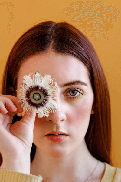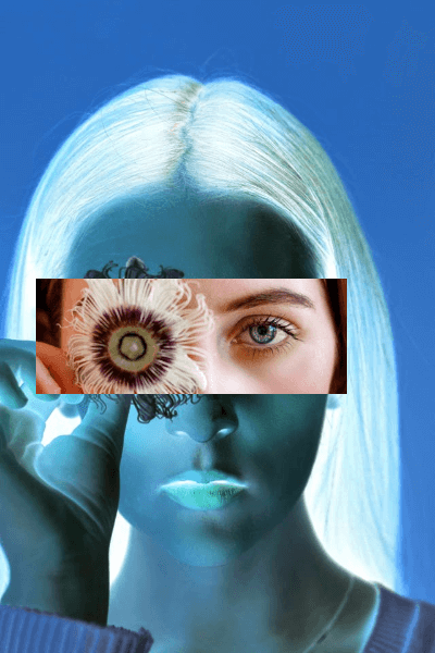 In this example, we create a unique visual effect of a PNG portrait of a woman. We place a rectangle with the size of 286 by 106 pixels over the woman's eyes, and invert the colors outside of this rectangle. This way, the entire portrait becomes negative except for the pixels inside the rectangle. (Source: Pexels.)