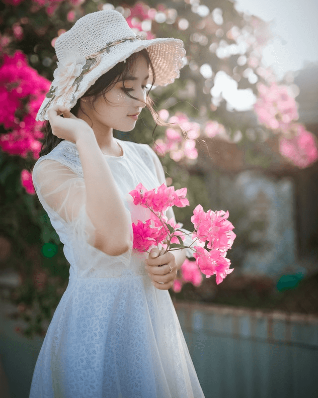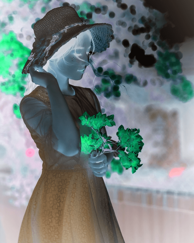 This example creates an inverted PNG picture of a girl with a hat holding pink flowers. The inversion area covers the entire picture and turns the pixels in the girl's white hat and white dress into black pixels and pixels of the pink flowers into pixels of green shades. (Source: Pexels.)