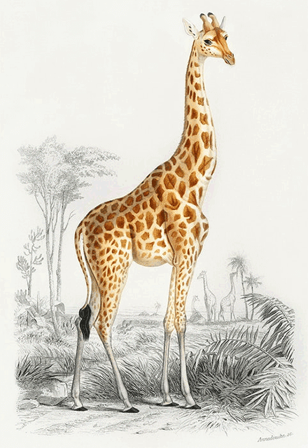 This example downsizes a PNG illustration of a giraffe from Charles Dessalines D' Orbigny's famous illustration book "Dictionnaire Universel D'histoire Naturelle". By downsizing the PNG's height from 440px to 200px, the giraffe's neck becomes much shorter.