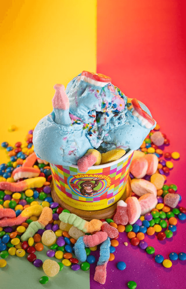 In this example, we upload a vibrant PNG image of an ice cream covered in gummy worms and Skittles. We select the right half of the PNG by dragging the rectangular shape over it and positioning it at 332 pixels from the left. Then, we apply the color reversal effect inside this shape. As a result, the pink-red background turns into a blue-green background and the milk ice cream in the cup turns into chocolate ice cream. (Source: Pexels.)