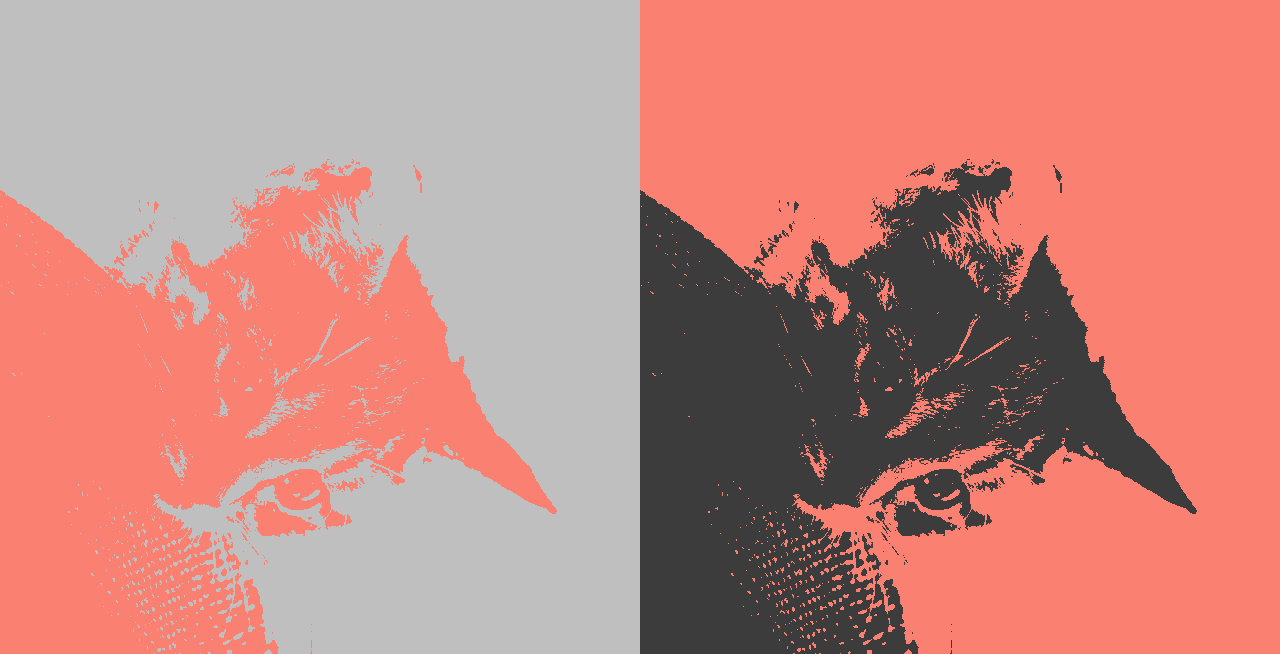 This example separates a grayscale PNG of a cat into two layers. It extracts colors using the quantization algorithm, which automatically identifies light gray and dark gray as the two dominant colors. It places the two layers side by side and fills the transparent areas with a salmon color. (Source: Pexels.)