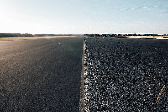This example selects and sharpens the right half of a PNG picture by 150%. Pixels on the right side of the road become rougher and more detailed but the pixels in the left half are left untouched. (Source: Pexels.)