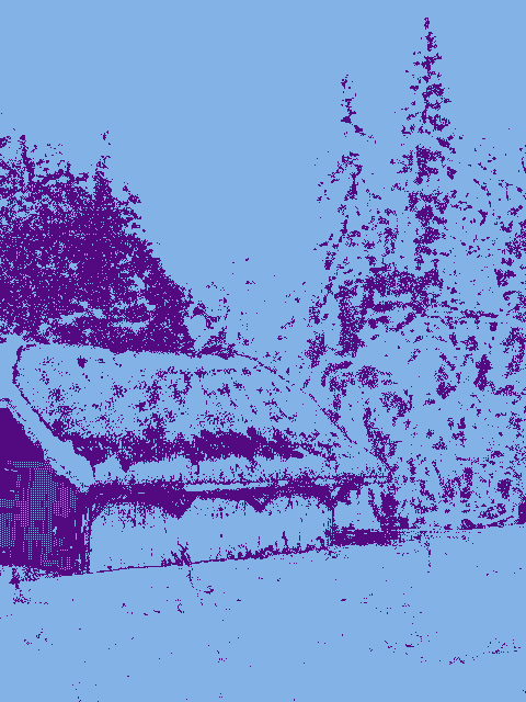 In this example, we detect near-gray pixels in a colorful PNG of a snowy forest cabin. Since nature rarely contains perfectly gray pixels, we increase the threshold to 5, allowing pixels with minor RGB variances to be included. To make the analysis visually striking, we apply custom mask colors: deep purple for grayscale regions and light blue for everything else. This reveals the structural silhouettes of the cabin and trees. (Source: Pexels.)