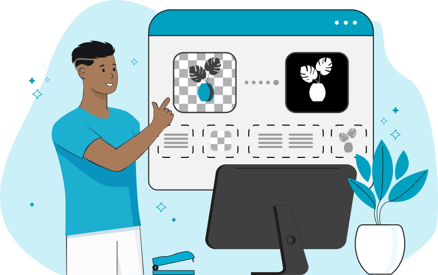 In this example, we show the areas of a transparent PNG file using a simple three-color alpha mask. The black region in the output mask represents the leaves of the plant, which are non-transparent pixels with an alpha channel value of 1. The lime color is concentrated at the edges of the plant leaves and represents semi-transparent pixels with an alpha channel value greater than 0 but strictly less than 1. Finally, the transparent color is placed around the plant and represents the original transparent area with an alpha channel of exactly 0. (Source: Pexels.)