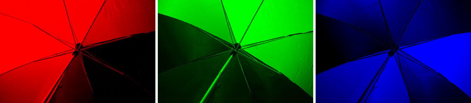In this example, we split a PNG image of a multicolored umbrella into its individual RGB components. The red component is most prominent in the red, orchid, gold, yellow, and lime sections of the umbrella. The green component is present in the gold, yellow, lime, and sky blue sections of the umbrella. The blue component is most pronounced in the lime, sky blue, midnight blue, and blue sections of the umbrella. (Source: Pexels.)