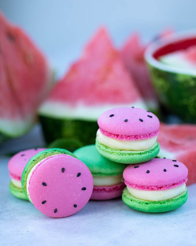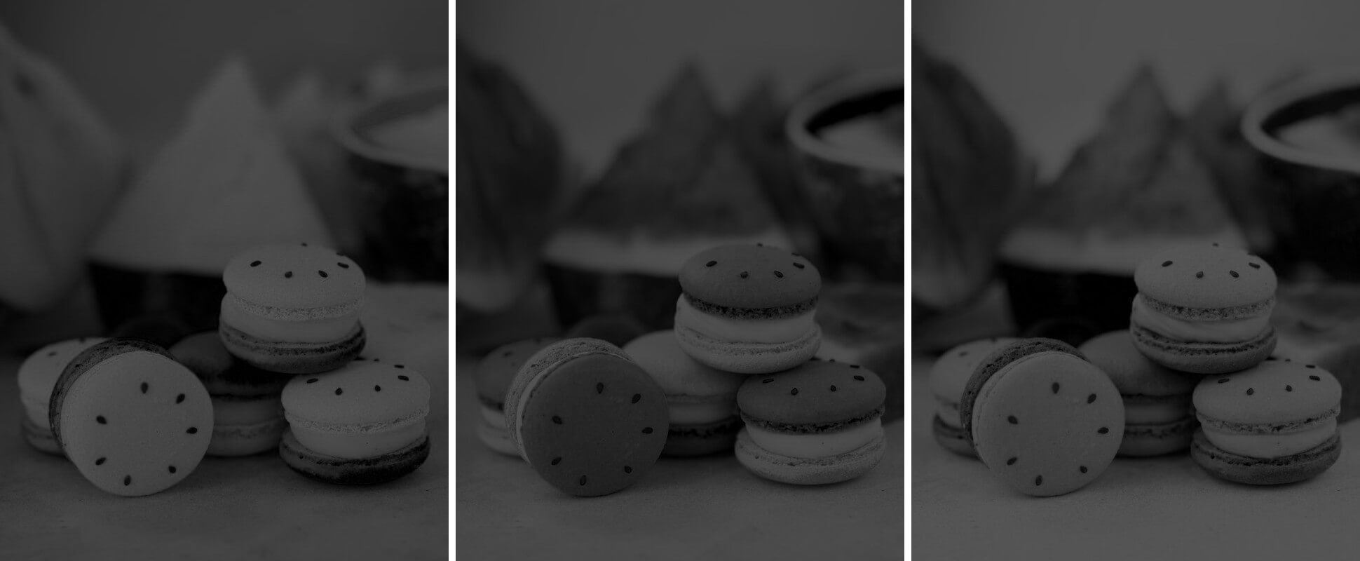 This example demonstrates a PNG image of watermelon macaroons under the prism of grayscale tones. At first glance, the images may seem indistinguishable, but upon closer inspection, it becomes apparent that in the red channel, bright watermelon pixels indicate a red hue, in the green channel, dark tops of macaroons lack a green tint, and in the blue channel, bright macaroons and a dark watermelon indicate the presence of blue in macaroons but not in watermelon. (Source: Pexels.)