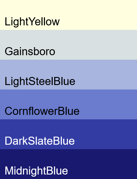 This example generates a stepped color palette that smoothly steps from the pale warmth of LightYellow to the deep coolness of MidnightBlue. We define 4 transition steps, resulting in a total of six visually distinct shades. We apply the Perceptual interpolation method. This technique calculates color steps based on human color perception, ensuring a natural and visually uniform progression from light to dark. The resulting palette is presented vertically using wide swatches (460x100px), with each generated color labeled by its closest named equivalent for easy identification.