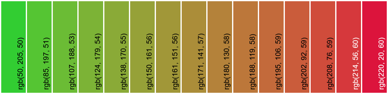 In this example, we create a detailed discrete gradient of 13 transition steps between LimeGreen and Crimson (yielding a total of 15 color shades). We use LAB color interpolation, which produces a balanced progression – not overly bright and saturated as in HSL or LCH, and not too dark or muddy as in RGB or perceptual modes. We configure the palette to display horizontally (left-to-right), adding a 4-pixel gap between each color swatch and 4-pixel outer padding. Each color is labeled with its RGB code, making the palette especially useful for developers working with precise color values.