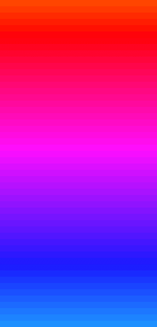 In this example, we create a long vertical sequence of color transitions that begins with vivid OrangeRed and shifts into DodgerBlue. With 50 midpoints defined, the palette contains 52 distinct swatches, forming a detailed, discrete gradient. Since orange and blue are nearly opposite on the color wheel, the resulting palette passes through intermediate steps of purple and magenta, producing a beautiful rainbow-like distribution of hues. The palette is displayed vertically with narrow swatches (500×20 pixels), without gaps, padding, or labels.