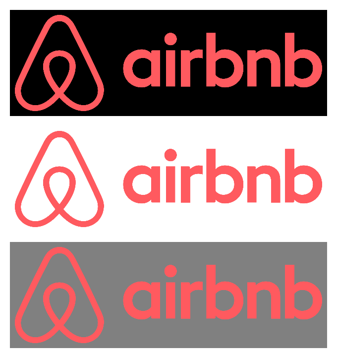 This example checks how the Airbnb logo PNG appears on black, white, and gray backgrounds. The previews are stacked vertically with 20px padding and 20px gaps between them. The test clearly shows that the logo works best on white or black, while gray provides a less distinct contrast. (Source: Wikipedia.)