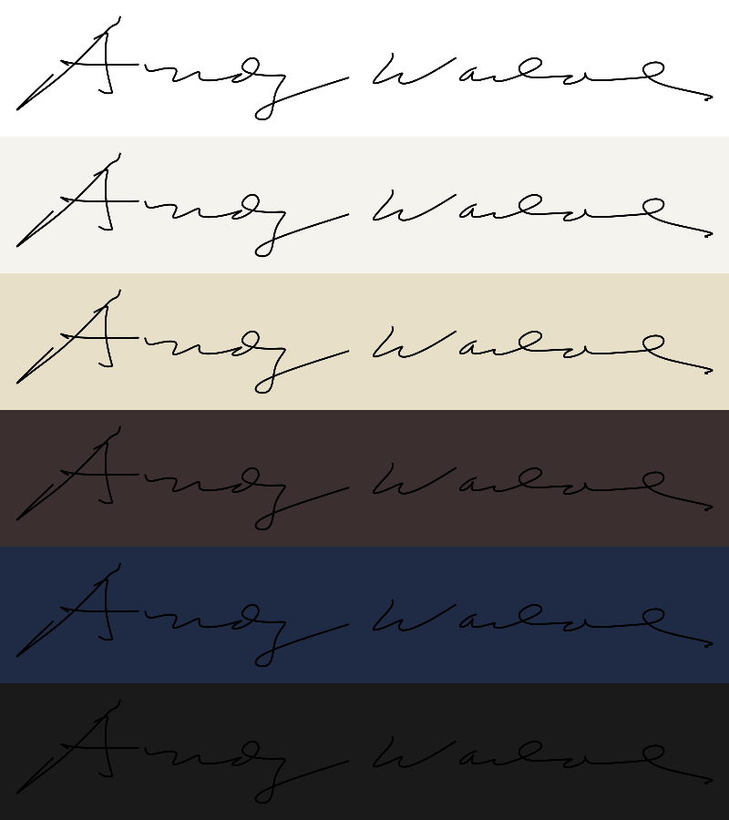 In this example, we preview an electronic PNG signature of Andy Warhol on six different types of parchment paper. We input six distinct paper colors using RGB codes and generate a vertical sequence of the PNG signature tiles. As shown, the first three signatures placed on light parchment tones are clearly readable, while the subsequent three colors, which are dark, make the signature difficult to distinguish. (Source: Wikipedia.)