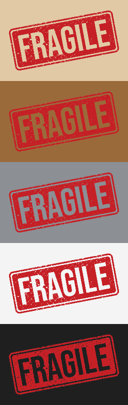 In this example, we place a transparent "FRAGILE" stamp PNG on five different box colors to evaluate stamp visibility. We observe that the stamp is least visible on the sienna-like color (#9B6A3A). Based on this result, we recommend using a stamp with a different brightness for boxes of that color to ensure clear visibility. (Source: Vecteezy.com.)