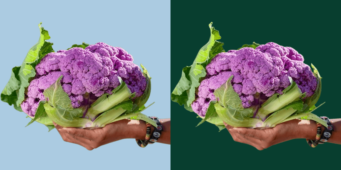 In this example, we upload a PNG image of purple cauliflower held in hands, which will be used on a farming website. To ensure the image looks equally good across different site blocks, we test it against two corporate brand colors: #ABCBE1 (light blue) and #083E2F (dark green). We arrange the previews horizontally so the image can be compared side by side. The result clearly shows that the PNG image maintains its quality and visibility on both light and dark backgrounds. (Source: Pexels.)