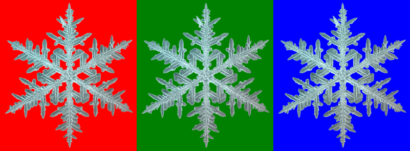 This example tests a transparent snowflake sticker PNG against three primary background colors: red, green, and blue. Based on the sticker's appearance on these colors, we can plan the cover color for holiday greeting cards. Visually, the sticker is most contrasting on the red background, most monochromatic on the green, and most natural on the blue. To prevent the output image from being too large, we apply a 50% scaling percentage to each PNG tile. (Source: Pexels.)