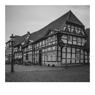 In this example, we activate the option "Grayscale Polaroid" and convert a multi-color PNG picture of a house to a black-and-white polaroid. We add the white border around the PNG and leave the polaroid without a signature. We set the picture dimensions to 330 by 300, add 20 pixels to the top, left, and right sides, and 50 pixels to the bottom. Thus, we get a square-shaped polaroid of size 370 by 370 pixels. (Source: Pexels.)