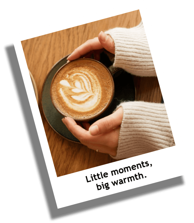 In this example, we transform a cup of coffee photo in PNG format into a cozy polaroid snapshot. We add a thick white frame and a two-line caption, "Little moments, big warmth." at the bottom. The caption is set in Trebuchet MS font, made bold, and centered. To give it a more natural feel, we rotate the polaroid by 15 degrees and add a custom shadow with a horizontal offset of -30 and a vertical offset of 30, making it appear as if the photo is casting a shadow behind it from the light source. (Source: Pexels.)