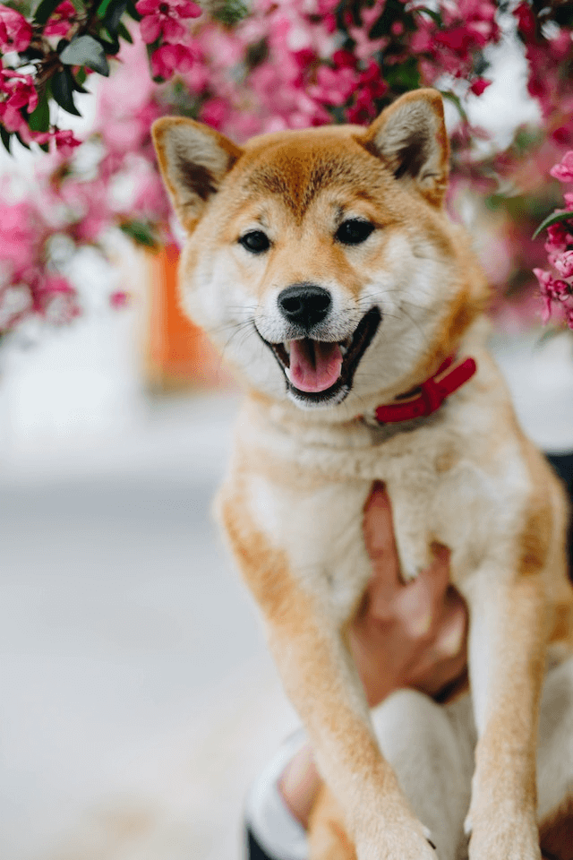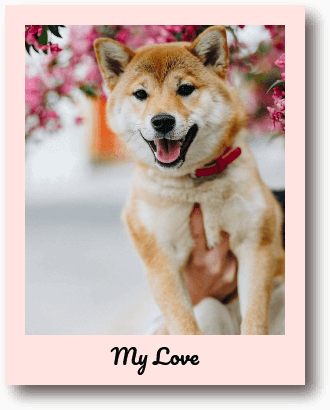 In this example, we wrap a PNG of our beloved dog in a polaroid. We use a soft misty-rose color frame that matches the color of the sakura tree in the background and caption the photo as "My Love". For the caption, we choose the prettiest Google font "Pacifico" and load it using the font URL (after selecting the custom font mode). We also add a shadow in a gray-pink hue, which gives the image depth and makes it look like a real polaroid. (Source: Pexels.)